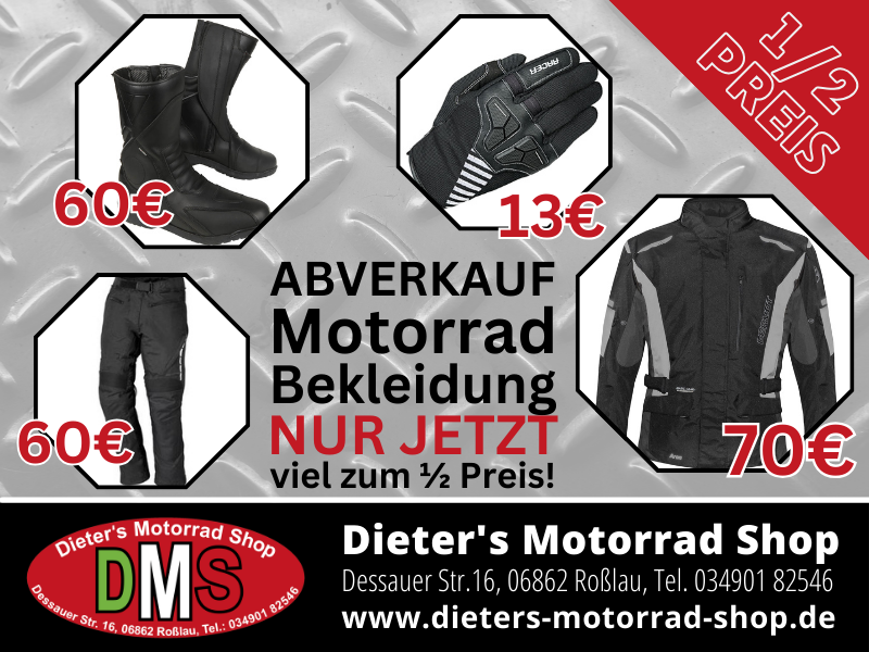 Wir haben aktuell einfach zu wenig Platz. Deshalb gibt es die Motorrad Bekleidung aus der Vorsaison jetzt zum halben Preis!